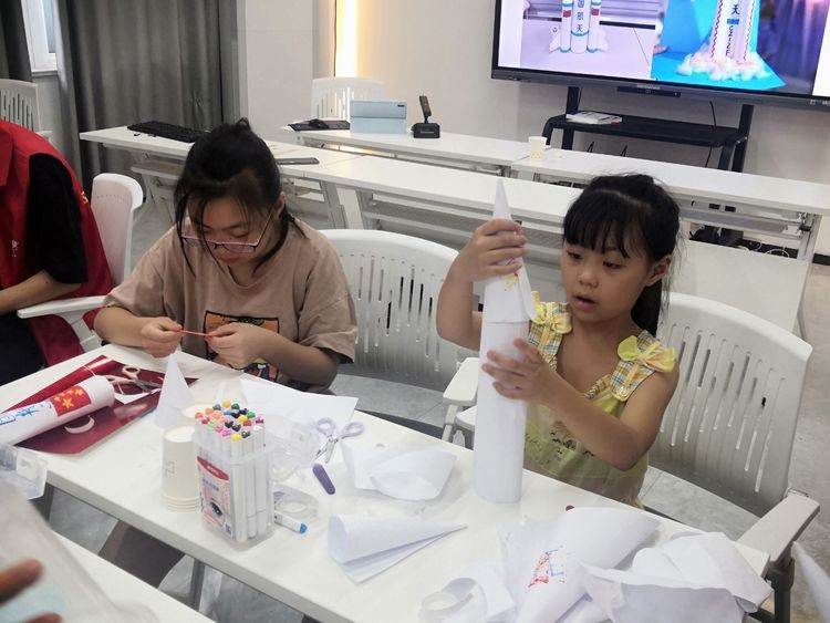 手工制作航天夢:在志愿者的幫助下,孩子們紛紛開始動手,互相幫助,用手工的形式表達了自己的航天夢想,用剪、粘、貼的形式做出了孩子們心目中各式各樣的“火箭”。