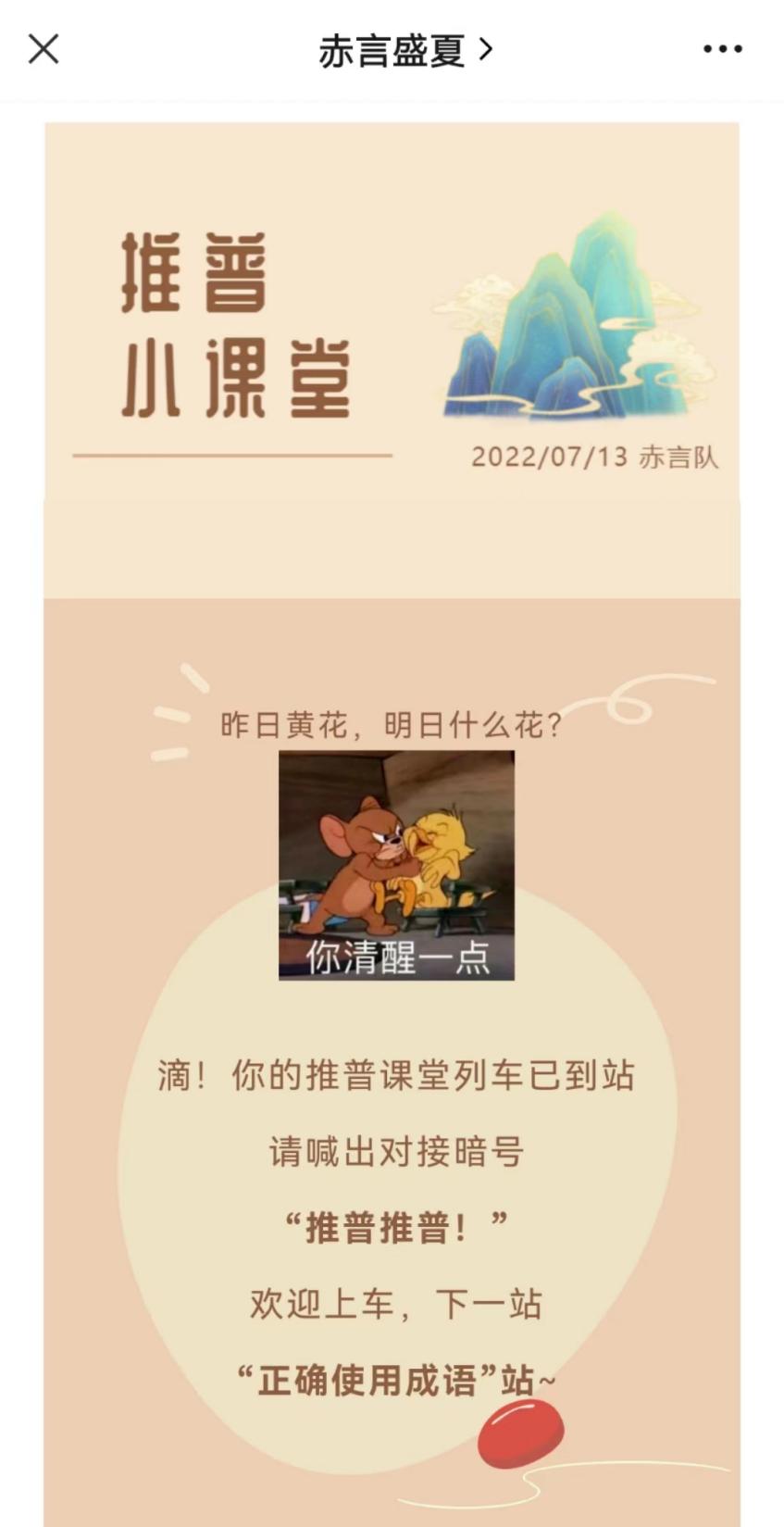 語言文字的魅力無法在短短的幾節(jié)課內(nèi)全部展現(xiàn),位于“大語言文字工作”的格局下,語言文字科普早已勢在必行。赤言隊實踐服務(wù)隊靈活運用多媒體手段,于“赤言盛夏”微信公眾號中打造“推普小課堂”欄目,定期發(fā)布與語言文字知識相關(guān)的科普推送,其中包括“聲韻母辨析”“易錯讀音辨析”“正確使用成語”等多個不同主題。這不僅能夠進一步幫助學(xué)生鞏固所學(xué)知識,拓寬學(xué)習(xí)廣度,同時也為包括學(xué)生在內(nèi)的廣大群眾提供了學(xué)習(xí)語言文字的平臺,豐富了學(xué)習(xí)渠道。