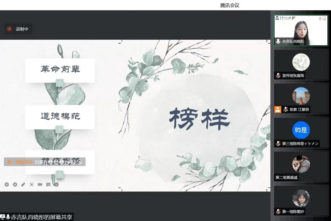 “品贊紅詩,禮贊百年”由文教組組員王嘉琪開展授課,主講人帶領學生感悟著黨的百年歷史,從過去到現在,再到未來,紅色經典融入我們華夏兒女奔騰的熱血中,始終流傳于我們心中。