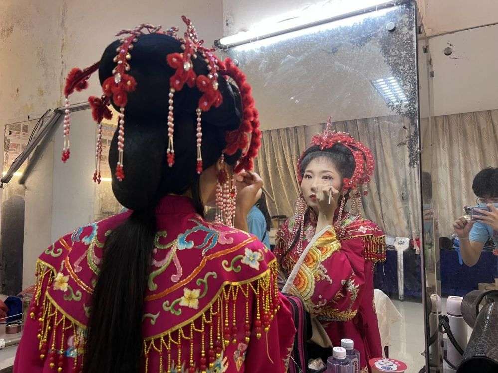 汪團長帶領我們深入候場化妝間,深入了解黃梅戲演員如何化妝、服飾如何穿戴,音響、燈光、舞美如何配合,我們近距離觀察了黃梅戲的精細之處。汪團長表示,潛山市黃梅戲劇團成立于1952年,是安徽省最早成立的專業藝術表演團體之一。七十年來,潛山市黃梅戲劇團在黨的文藝方針、路線、政策指引下,不斷發展壯大,演出足跡遍及大江南北,城市農村;培養和造就了一大批卓有成就的藝術人才;在“出人、出戲、出效益”方面做了大量工作。