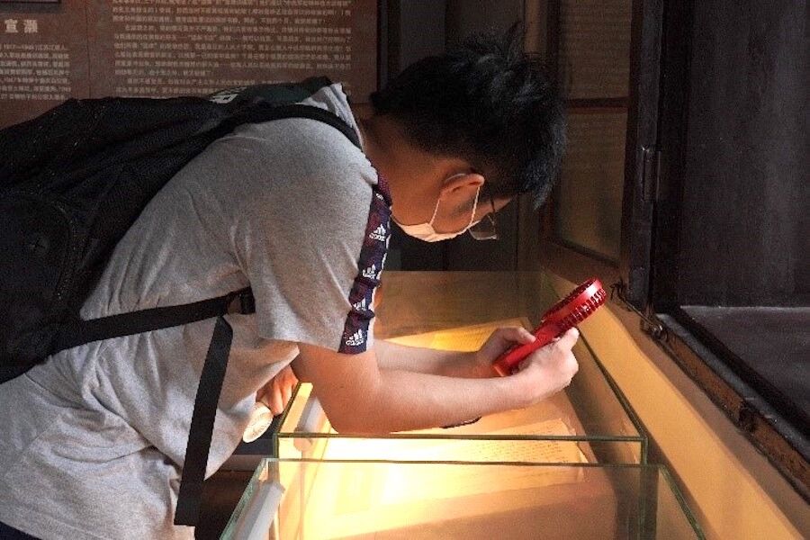 圖為實(shí)踐隊(duì)員在紅巖遺跡認(rèn)真學(xué)習(xí)紅巖知識