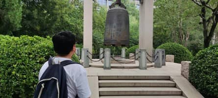 接著實踐隊員們來到一個大鐘前,鐘上刻著“勿忘國恥”四個大字,記錄著五三慘案的故事,借此告誡人們警鐘長鳴,勿忘國恥。
