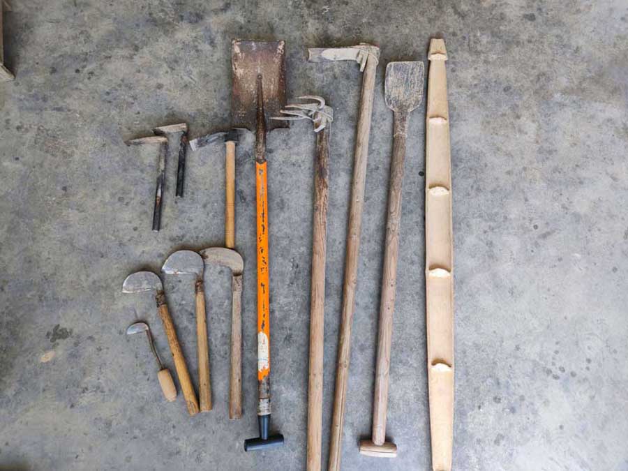 據走訪調查,浙江臺州當地水稻種植種植制度確屬“一年兩熟”,即每年水稻種植分早稻、晚稻兩季,清明(農歷3月中旬)前后播種早稻,經關田、插秧、施肥后于農歷6月中旬收割,在早稻收割后同時間播種晚稻,約于農歷10月底收割晚稻;栽培稻品種經小暑白,中白,早粳(某種具短芒水稻種)、矮腳晚稻(俗名,學名未知)等多代選育后,現今多以種植“雜交稻”為主,畝產最高可超千斤,已完全足以供給百姓日常生活需要,但由于水稻種植利潤低、回報少的問題,現今當地的農戶各家水稻種植面積正在逐步縮小,農戶實際所食用的大米大多從外購買而非自家生產;在農業生產細節方面,在早年天氣預報未普及之時,農民便依靠代代相傳的民間俗語,通過對彩虹、云朵形狀以及節氣前后的異常天氣情況實現對天氣變化的預測。在走訪過程中,農戶們熱情萬分,在向團隊成員分享水稻種植知識的同時,還熱情地展示了他們農作的工具并詳細地分享了各類農具使用的方法和作用。