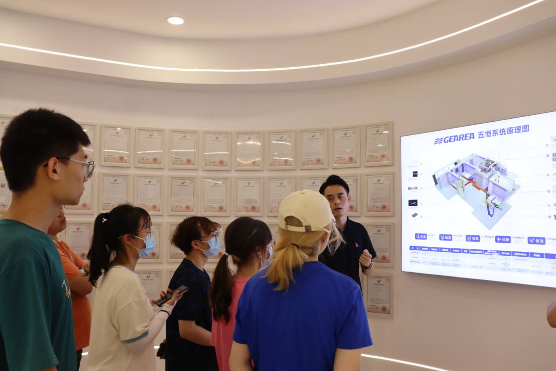 2022年7月1日,五恒健康住宅社會實踐小分隊趕赴常州,繼續開展“五恒系統案例”線下調研,第二站小分隊來到了格瑞公司工廠現場調查,技術經理首先帶大家去到展廳長廊進行講解。他為我們全面介紹了五恒系統,之前小隊成員們對其的了解僅限于“什么是五恒”,經過經理細致的講解,隊員們了解到,“五恒系統”是以冷熱輻射為溫度控制末端、獨立新風系統和置換送風結合,為用戶提供可分區控制的健康、舒適、便捷、節能的居住環境。這套組合系統全面替代了中央空調、地暖、新風、凈化器、加濕器等多種傳統電器系統。