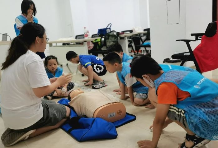 循循善誘、言傳身教。實(shí)踐隊(duì)二組成員與硚口區(qū)團(tuán)委合作分別去往硚口區(qū)園博南、古田、營南、四新、葛洲壩、長源、宜美七個社區(qū),在社區(qū)暑假托管班中開展應(yīng)急救援知識小課堂。小隊(duì)成員立足專業(yè),注意理論與實(shí)踐相結(jié)合,常識教學(xué)與科普宣講并重,給社區(qū)的小朋友們帶去豐富實(shí)用的急救知識。課堂內(nèi)容從了解自己的身體開始,小老師們帶著小朋友按照從外到內(nèi)、從上到下的順序梳理了身體各部位可能遇到的意外傷害和相應(yīng)地救治和預(yù)防措施。除此之外,隊(duì)員們還模擬突發(fā)情況教會小朋友們?nèi)绾螕艽?20、出血手部包扎、骨折包扎、海姆利克急救法、心肺復(fù)蘇術(shù)等基本的急救措施。課堂結(jié)束后,實(shí)踐隊(duì)同時送出印有海姆利克急救法和心肺復(fù)蘇等一些急救小口訣的扇子、便利貼和小卡片,以求通過這種方式加深小朋友對急救知識的印象,提高他們急救知識技能的掌握程度。
