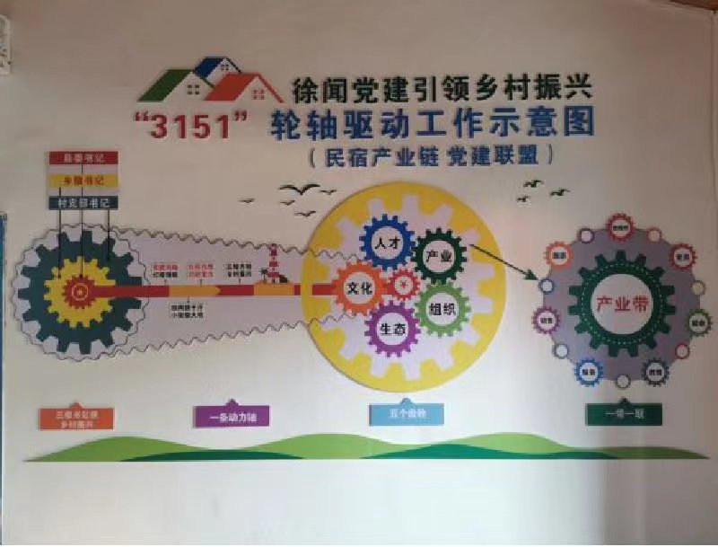 “民宿產業鏈聯盟,即一名黨員對接一間民宿進行管理互動機制模式。角尾鄉放坡村旅游業 “黨建+” 發展模式,鄉黨委依托放坡村民宿建設了“放坡村人才驛站”,深入實施“3151” 工程,即縣、鄉、村3級書記引領鄉村振興,以一個動力軸,帶動組織、人才、產業、生態、文化等5個齒輪互動共進振興,促進一個產業聯盟帶機融合發展。“產業鏈黨建聯盟”+人才驛站工作相輔相成,以產業振興撬動人才振興,人才振興反哺產業振興,合力助推鄉村振興齒輪。”放坡村駐村第一書記馮磊介紹說。