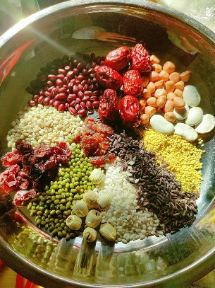 臘八粥是一種在臘八節用由多種食材熬制的粥,也叫作七寶五味粥。臘八粥傳說來自印度天竺,農歷十二月初八時佛陀成道紀念日,俗稱“臘八節”,在佛教稱 “法寶節”。臘八粥的習俗,已非佛門所有,作為一種民間風俗,農歷十二月八日吃臘八粥,用以慶祝豐收,一直流傳至今。最早的臘八粥是用紅小豆來煮,后經演變,加之地方特色,逐漸豐富多彩起來!堆嗑q時記.臘八粥》:“臘八粥者,用黃米、白米、江米、小米、菱角米、栗子、紅江豆、去皮棗泥等,開水煮熟,外用染紅桃仁、杏仁、瓜子、花生、榛穰、松子及白糖、紅糖、瑣瑣葡萄,以作點染。”臘八粥和臘八飯一樣,是古代蠟祭的遺存。
