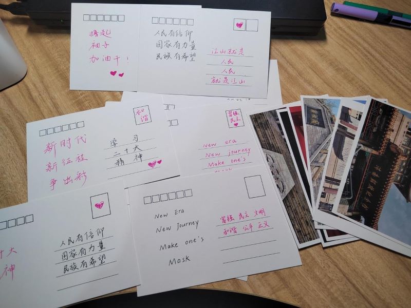 翻譯學院二十大譯心益民實踐隊部分隊員圍繞二十大這一主題展開,進行明信片繪制,為明信片融入民生精神元素,并為明信片設計精美的圖案。隊員們用自己親手制作的明信片展現自己對二十大民生精神的理解,用擺攤售賣二十大明信片的方式來宣揚二十大民生精神。此次的明信片繪制活動,不僅讓隊員們收獲豐富,感悟頗多,還讓隊員們對二十大民生精神有了更為深入的理解與認識。