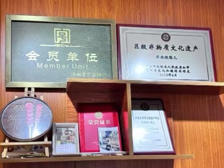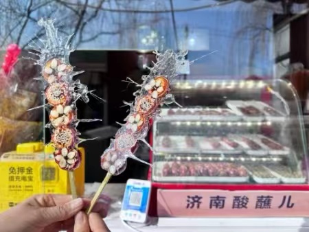 酸蘸兒傳承人張正倫熱情地為隊(duì)員介紹酸蘸兒的原材料,使用濟(jì)南南部山區(qū)的金星面楂、冰糖、香油以及老濟(jì)南獨(dú)有的泉水,通過11道手工工序和獨(dú)特的“甩糖翅兒”工藝制作而成。酸蘸兒有20多種,其中最受歡迎的一種叫梅花烙,用瓜子仁貼成梅花的形狀,再加上白芝麻的點(diǎn)綴,恰似梅花傲雪。