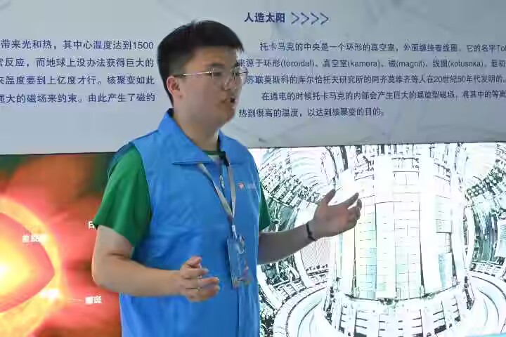 宣講人劉漢以人造太陽為主題開展科普。以核能分為為反應與核能釋放為起始,具體講述核反應的原理與核能釋放的兩種方式-核裂變與核聚變。用太陽的產能方式為例,詳細的講解人造太陽-托卡馬克的產能方式與結構狀況。