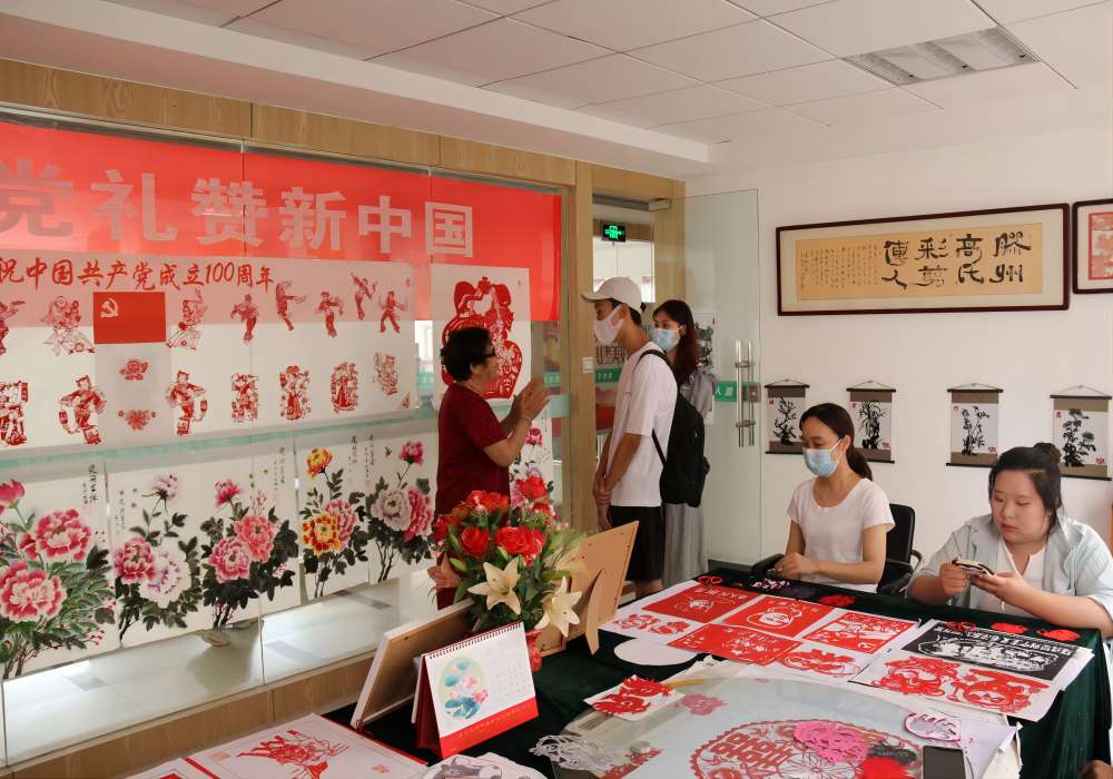 為了能夠直觀了解新時代文明實踐站建設情況,實踐隊員走進歷史文化展示室,展示室內正在開展剪紙教授活動,黨員高義蘭作為非物質文化遺產傳承人,免費教授居民剪紙技藝,傳承傳統文化。高義蘭興致勃勃地向實踐隊員說:“希望居民通過參與剪紙,感受傳統文化的魅力,豐富精神文化生活。”實踐隊員在與參與課堂的居民的交談中得知,社區還建立了圖書館,配置了圖書數萬冊,涵蓋農業、文學、哲學等各類書籍,并會定期進行圖書資源更新,以滿足各個年齡段不同人群的閱讀需求,提升居民的道德精神建設。