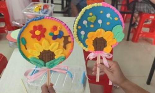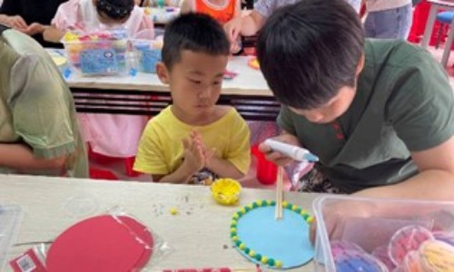 制作“老師”,現場分步演示制作步驟,同時與小朋友們起制作團扇,幫助他們完成為團扇粘白乳膠和橡皮泥,用一次性筷子制作扇柄,為裝飾完成的作品系上蝴蝶結等工作。