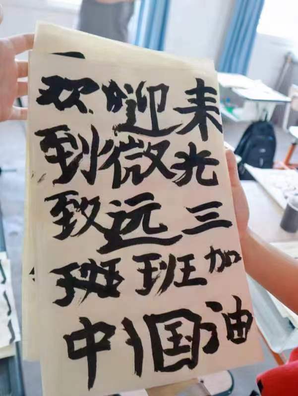 小朋友們還跟隨賴老師和安老師學習寫毛筆字。老師們先講述了書法相關知識,學生們也非常認真,安靜、仔細地聽課。隨后,老師們讓學生自己嘗試寫字,并展示自己的作品。同學們思維活躍,行云流水,揮灑筆墨,最終得到獨一無二的作品。