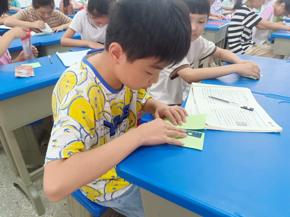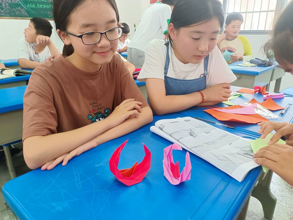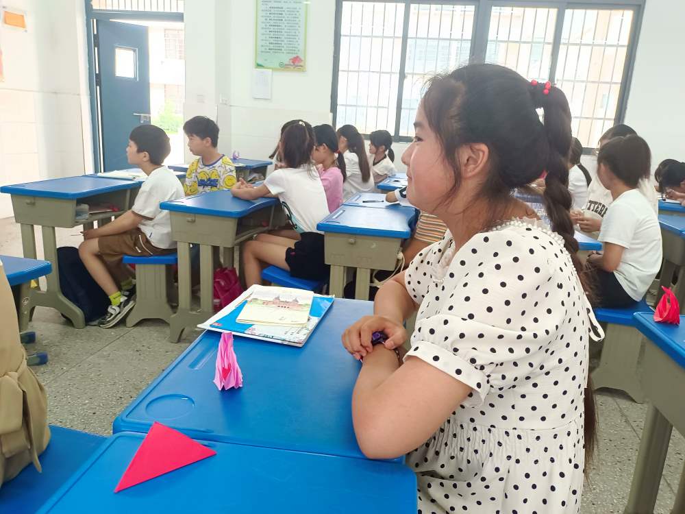 看手工課堂,小老師耐心地指導學生們一步一步地完成月亮兔子折紙,折紙活動可以陶冶學生美的情操。一張張色彩鮮艷的紙,折一折、剪一剪,就能變出一件件生動形象、饒有趣味的作品。學生們發出一聲聲的贊嘆,喜愛之情溢于言表。