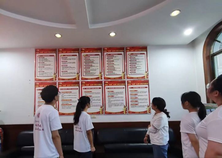 7月9日上午九點,實踐隊員到達村委會辦公地點,村委會工作人員對實踐隊員的到來表示了熱烈歡迎并帶領實踐隊員參觀體驗村委會辦公日常。工作人員分別從支部建設,所獲榮譽,值班工作,基礎設施建設等多個方面詳細闡述了現代化鄉村基層治理。首先,工作人員為實踐隊員講解了五星支部建設內容,從政治、文明、經濟、法治、生態等多個方面入手創建“五星”支部,引領鄉村振興。稍后,實踐隊員紛紛就支部建設提出了自己關心的問題,村委會的工作人員一一進行了耐心且詳細的解答。此外,工作人員還帶領實踐隊員參觀了高村村委會所獲榮譽,一張張榮譽證書無不彰顯著高村在新時代下鄉村治理的成功。