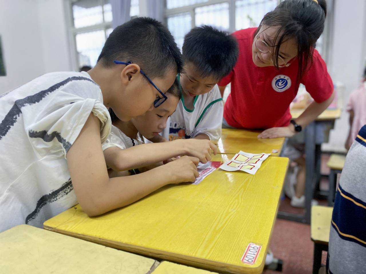最閃耀的星星是五星紅旗的光芒。課堂伊始,志愿者帶領(lǐng)小朋友們學習認識關(guān)于祖國的五面旗幟,并通過趣味游戲引導孩子們記住旗幟的特征,說出旗幟的圖案和顏色代表的內(nèi)涵。孩子們用貼紙將旗幟貼在正確的位置,表達內(nèi)心對國家的喜愛。在宣傳國旗知識時,志愿者帶領(lǐng)孩子們制作了簡易國旗升降機,大家表現(xiàn)出濃厚的興趣,志愿者的引導加深了孩子們心中對國旗,對祖國的尊敬。課堂最后,孩子們合唱了《歌唱祖國》,稚嫩的聲音表達的是對祖國的一腔熱情。