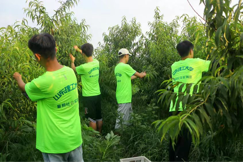 早上5時30 分,實踐團負責人與蜜桃種植基地負責人取得聯(lián)系,實踐團成員一行進入種植基地進行沉浸式的摘桃體驗。連片桃樹枝繁葉茂,果實綴滿枝頭,果香芬芳撲鼻。據(jù)實地考察和有關負責人的介紹,這里出產(chǎn)的蜜桃,具有桃形周正、著色均勻、甜美多汁、香氣濃郁等特有品質(zhì)。采摘過程中,實踐團成員向基地工作人員請教采摘注意事項,基地工作人員演示蜜桃采摘并給出耐心解答。最后,實踐團同蜜桃基地工作人員一起將采摘后的蜜桃搬運、裝車并運至分揀中心,分揀中心的工人們將會根據(jù)蜜桃質(zhì)量進行分揀。