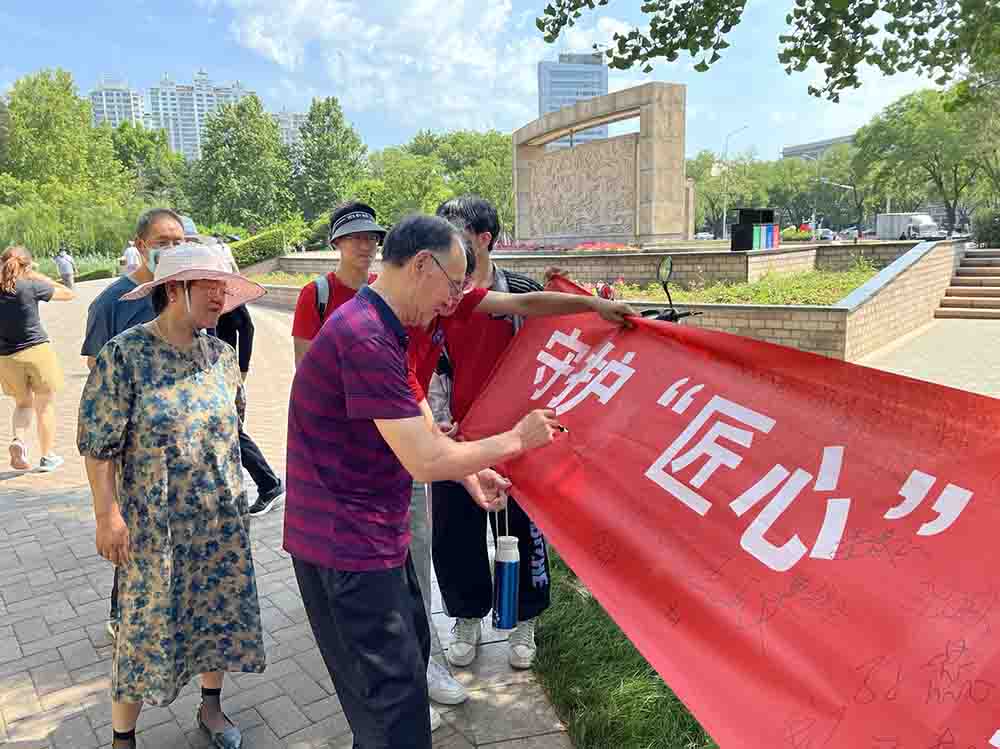 7月11日“情系筑城工匠,砼輩奮楫篤行”社會實踐團隊前往山東省淄博市人民公園開展群眾動員工作。在得到園區管理人員允許后,活動正式開始。活動伊始,“情系筑城工匠,砼輩奮楫篤行”社會實踐調研團在人民公園內懸掛宣傳標語,并對市民就關愛建筑工人話題進行采訪,以此來了解現代社會人民群眾對建筑工人的態度及關注程度。與此同時,實踐團成員邀請市民在橫幅上簽字,以此來提高市民對建筑工人的關注。在實踐團隊隊員的動員下,市民們情緒高漲,熱情的發表了對建筑工人行業的看法。