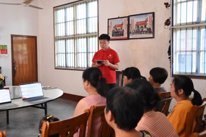 (圖為團隊成員為村民講解數(shù)字技能知識 李祺妍攝)