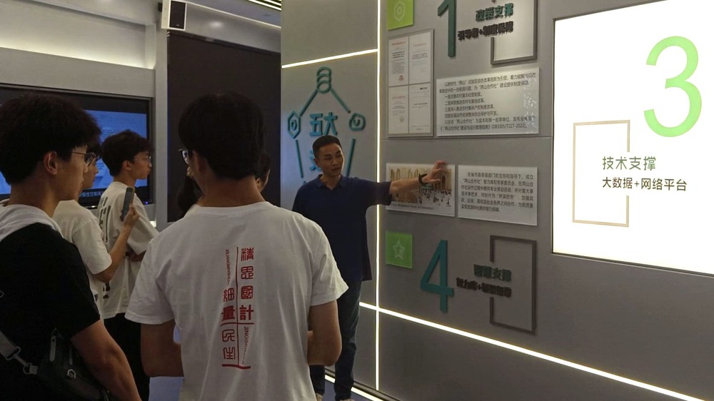 7月6日,隊員們來到安吉城投集團一樓的兩山合作社,在這里,兩山合作社綜合管理部副主任羅煜先為隊員們解釋了“竹林碳匯”的科學(xué)意義:將竹子通過光合作用吸收二氧化碳的過程視為碳減排,該減排量通過相關(guān)單位核驗后成為竹林碳匯,并通過市場交易平臺進行交易。