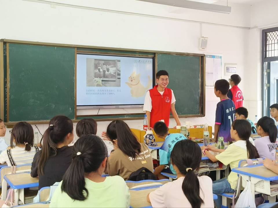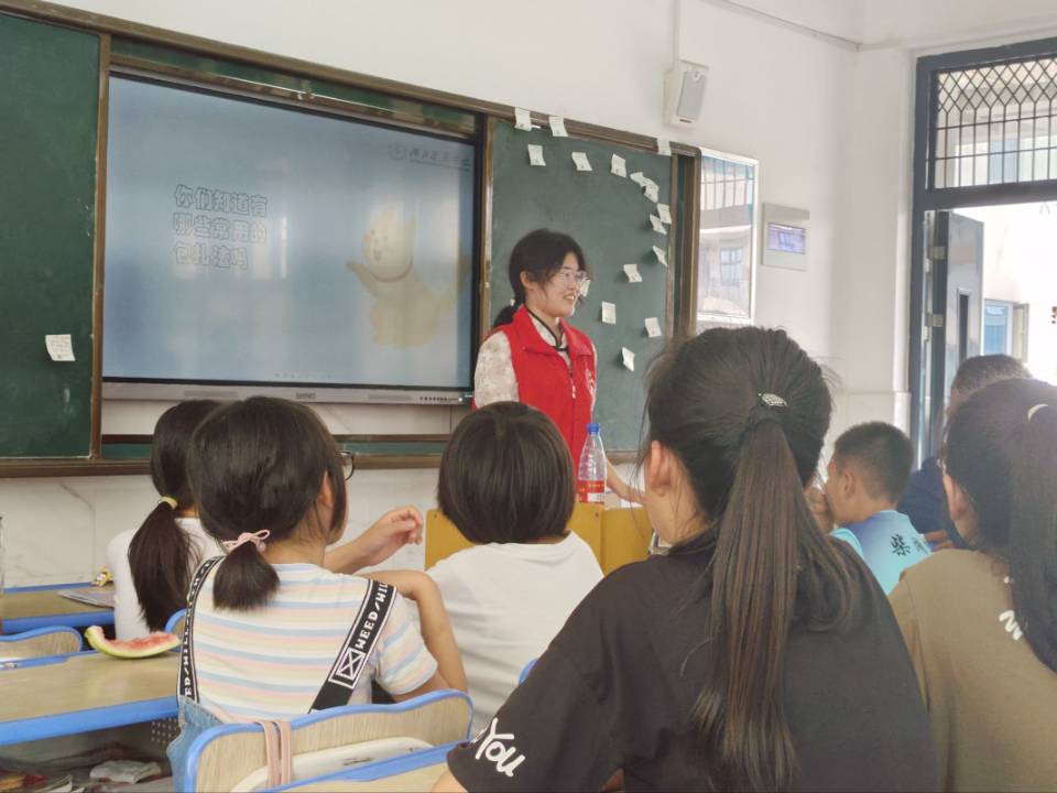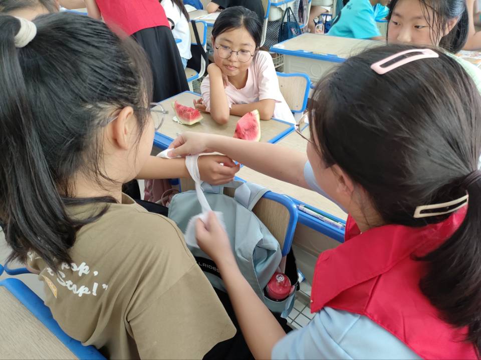圖為部分實踐隊隊員教授學生螺旋包扎法。薛夢燕 攝