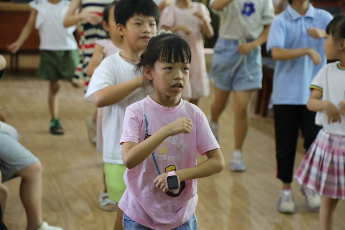 “雙臂展開,兩腳并攏”,7月11日,在盧佳瀅老師的帶領下,一首《小城夏天》伴著活力與歡樂,在嚴鳥村的盛夏與孩子們相遇。課堂之余,盧老師以擊鼓傳花、腦筋急轉彎等小游戲與孩子們互動,他們的每一個笑容,每一次跳躍,都將成為嚴鳥村最美好的記憶。整個課堂銜接緊密,環環相扣,孩子們不僅學到了知識,還鍛煉了身體。