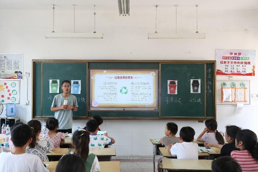 下午三點(diǎn)鐘,“又紅又專好青年”實(shí)踐團(tuán)的同學(xué)來到八義集中心小學(xué),與支教團(tuán)同學(xué)合作,為大家講解垃圾分類等環(huán)保知識。同時,其他班級也開展了豐富有趣的英語課、傳統(tǒng)服飾課等。