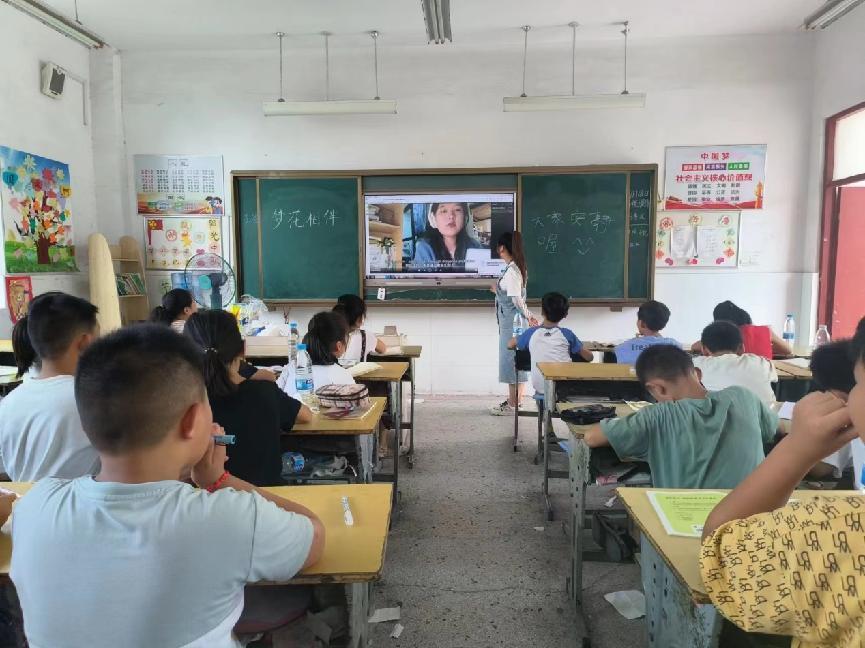 下午,余鄒藝在五年級進行戶外科普教學,內容是基礎地理知識。余鄒藝由講解海拔的定義引入課堂,接著以視頻形式向學生們展示不同海拔高度地區的自然風光和人文特色。最后,余鄒藝講解了地球的歷史演變和結構。下午教學課程結束后,“向遠筑夢”分隊在各個年級開展了“夢花相伴”活動。各班班主任組織學生觀看筑夢支教團往屆隊員給孩子們錄制的留言視頻,以親情陪伴的方式關心孩子們心靈的健康成長。
