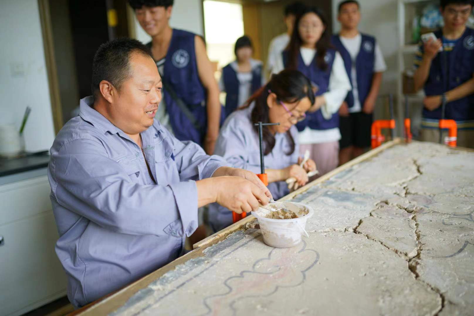 隨后,實踐團成員跟隨石館長來到了二樓文物修復室,在大時代的背景下,一群身懷絕技、妙手回春的文物修復師,默默地固守“冷宮”一隅,日復一日地打理著價值連城的“國寶”。當實踐團成員走進修復室時,深有感觸,實踐團成員有幸近距離看到這些一流工匠的工作狀態,聽聞他們回憶文物修復的點點滴滴。他們說:“這些文物是我們一塊一塊慢慢運進來的,我們在修復的時候不會破壞他的原樣,我們只是起到一個完善保護的作用,沒有的地方我們進行填充填色,不會對其添加任何不屬于他的東西”。工匠的驕傲并不是來自于炫耀自己修復過多少國之瑰寶,而是來自他們真實的感受以及他們修復過后的開心快樂。文物屬于過去式,但修復卻永遠屬于現在進行時,他們輕描淡寫地修復著常人眼中的無價之寶,只因這是他們的心之向往、靈魂所居,這種自發的專注,自然是工匠精神最可貴的地方。愿工匠精神能一直傳承下去,為淄博城市發展注入不竭動力,讓淄博流量變“留”量,促進淄博文化大繁榮,大發展。