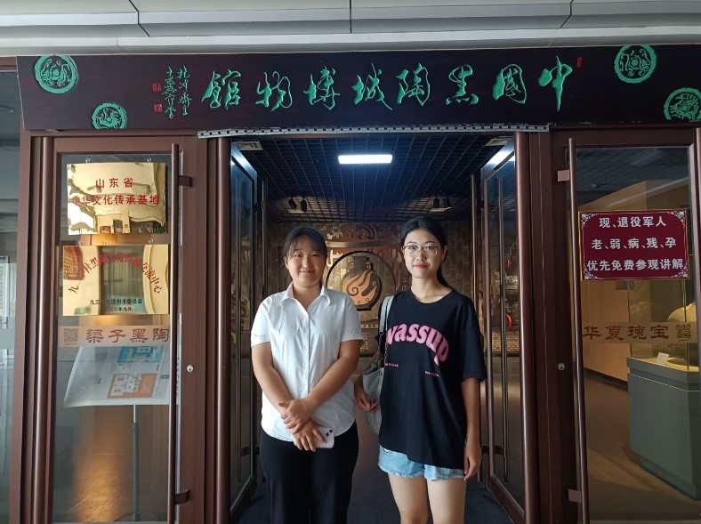 7月15日上午,隊員們來到了梁子黑陶博物館,工作人員熱情地接待了他們并帶領隊員們對館內藏品進行參觀。館內藏品眾多,亦有很多關于黑陶歷史的介紹。盤、瓶、罐、鼎等器皿在燈光下散發出厚重溫潤的光彩,一件件古樸與時尚相融的黑陶制品讓人仿佛穿越在現在和過去的時光中。隊員們從工作人員口中得知黑陶作為陶藝奇葩,上可追溯到早在父系氏族著名的大汶口文化,有著悠久的歷史人文底蘊。梁子黑陶制作具有選材、濾泥、成型、雕刻等十幾道工序,采用軟硬刻等多種技法在素面黑陶上雕刻加工,每件作品都是大師們的心血鑄造而成,不僅飽含著制陶大師對藝術的不懈執著追求,更多的是對國家非物質文化遺產的默默傳承。