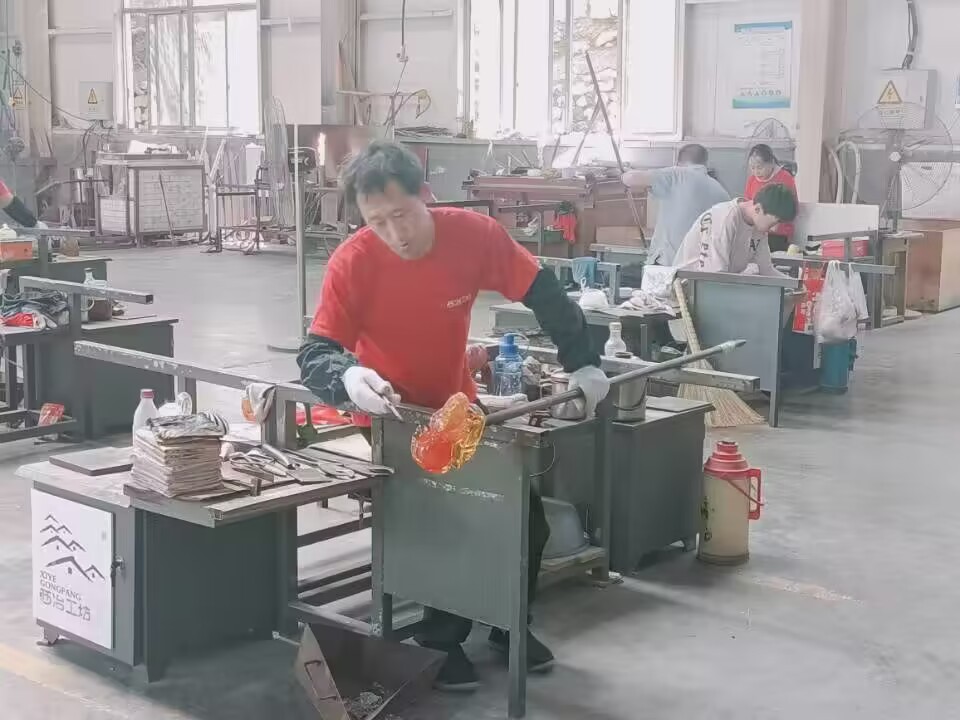 飲光而生 火凝為色隨后,實(shí)踐隊(duì)員們?cè)诠ぷ魅藛T的帶領(lǐng)下進(jìn)入窯爐車間,首先感受到的是撲面而來的熱氣,接著便看到工人師傅們奔跑往返于工位和爐子之間,在炎熱的工作環(huán)境中遵循嚴(yán)格的操作技巧進(jìn)行琉璃的制作。工人師傅們運(yùn)用各種傳統(tǒng)手法和技藝,制造出各種形狀各異的琉璃工藝品,無論是琉璃花瓶、酒具還是各種裝飾品,都展現(xiàn)了琉璃工藝的獨(dú)特魅力。