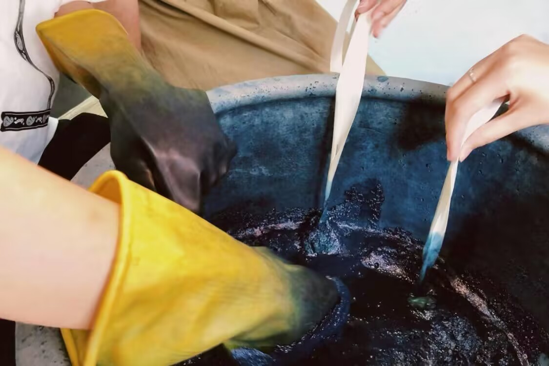 “從來沒有一朵花,從一開始就是花。”這朵花的努力綻放,讓人贊嘆,通過自身的努力大放光彩。染布也是這樣,一次次浸染,一次次的印記加深,皆是時(shí)間的淬煉。經(jīng)劉老師的介紹,染液的原料是由天然植物板藍(lán)根、寥藍(lán)等制作出靛泥,再次加入高度白酒、草木灰或工業(yè)堿、清水、冰糖等在適宜的天氣條件下發(fā)酵成最終的染料。將做好的棉布浸入染缸中,每一次浸入,顏色就加深一次。在適宜的天氣,發(fā)酵充分的情況下,染缸里的染料呈現(xiàn)是青色,染出的棉布的顏色也呈現(xiàn)出青色,在適宜的環(huán)境下慢慢呈現(xiàn)出藍(lán)色。