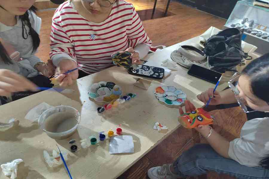 實踐團隊員們選取了兩個縮小版的儺面模型,汪儒斌老師告訴隊員們面具的配色沒有嚴格的要求。隊員們聯想到制作文創作品的思路,于是便依照一些人物角色來給面具涂色。她們沉浸在創作的樂趣中,不知不覺間,手中的面具都逐漸呈現出獨特的風格。一個是以游戲原神中的魈為原型,用青綠、黃和淺藍等顏色勾勒出霸氣而又神秘的角色形象;另一個是以賜科試的第一神靈魁星為原型,用紅、黃和橙等顏色描繪出高貴而又威嚴的天神形象。整個體驗過程充滿了創作的樂趣與成就感。最后,實踐團的孫悅恒和林宇蘭同學向汪老師介紹了上色的靈感來源并告訴汪老師,購買游戲或影視作品的周邊在現在的年輕人群體中比較流行,如果能將儺面具與當下一些熱門的游戲或影視角色相結合,做出的文創說不定能吸引許多年輕人的目光,儺文化也就能順勢推廣、讓更多人認識到了。