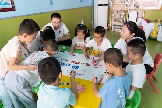 最后,所有隊(duì)員與小朋友們分組合作,共同完成了四幅關(guān)于“心佑工程”的圖畫(huà)。在隊(duì)員們的指導(dǎo)下,小朋友們手執(zhí)畫(huà)筆,一筆一劃、認(rèn)真謹(jǐn)慎地涂色,完成后盡管每個(gè)人手上都沾上了五顏六色的顏料,但卻沒(méi)有一位小朋友抱怨,因?yàn)槟鞘撬麄兣Φ囊?jiàn)證。每一位小朋友都頗有成就感,臉上洋溢著滿意的笑容。