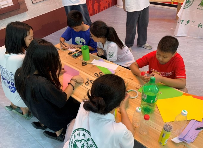 舊瓶子改造制作完手抄報之后,隊(duì)員們與小朋友一起收拾凌亂的桌面。稍作休息之后,開始了下一環(huán)節(jié),舊瓶子改造。這些瓶子會在小朋友手中被改造成什么有趣的模樣呢?實(shí)踐隊(duì)隊(duì)員在桌面擺了很多大小不一的塑料瓶子,由小朋友選擇想改造的瓶子。有一位小朋友用剪刀把塑料瓶從中間剪開,之后在綠色卡紙上畫了一只青蛙的形狀再把它剪下來,用雙面膠粘在瓶子上,一個青蛙圖案的筆筒就完成啦。還有小朋友把舊瓶子改造成一個有著搞怪表情包的筆筒,除了這些,還有小豬花瓶和貼著折紙花的瓶子,還有把瓶子剪成塑料片用膠水粘成一朵好看的塑料花,在小朋友的奇思妙想和極強(qiáng)的動手能力下,將一個個舊瓶子賦予其新功能使塑料瓶達(dá)到可循環(huán)利用的意義。