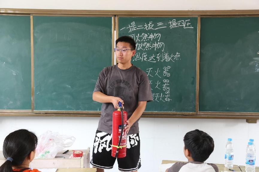 下午,唐俊寶同學在每個班級都展開了消防教育課。唐俊寶首先以一段火災視頻為引子,讓同學們意識到火災的嚴重性,再通過向同學們提問的方式講述了發生火災需要的三個條件。隨后,他結合滅火器實物講解了滅火器的基本結構和使用方法,并將使用方法編成一句簡單的口訣“一提二拔三握四壓”。最后,他結合圖片介紹了其他種類滅火器的滅火原理和基本組成。