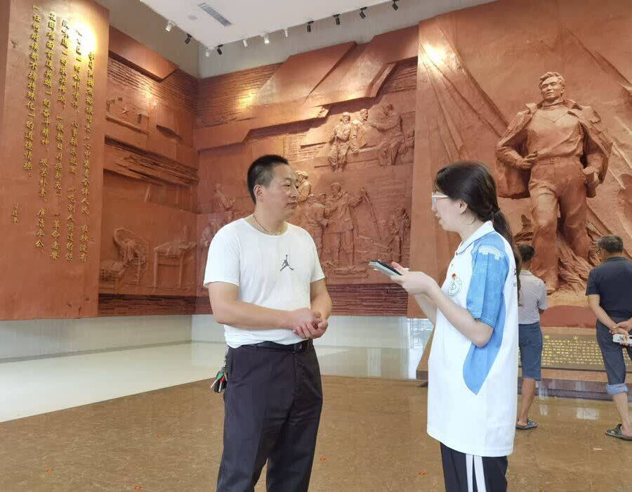 圖為實踐隊員在采訪焦裕祿紀念園工作隊員 通訊員 劉玉雄 攝