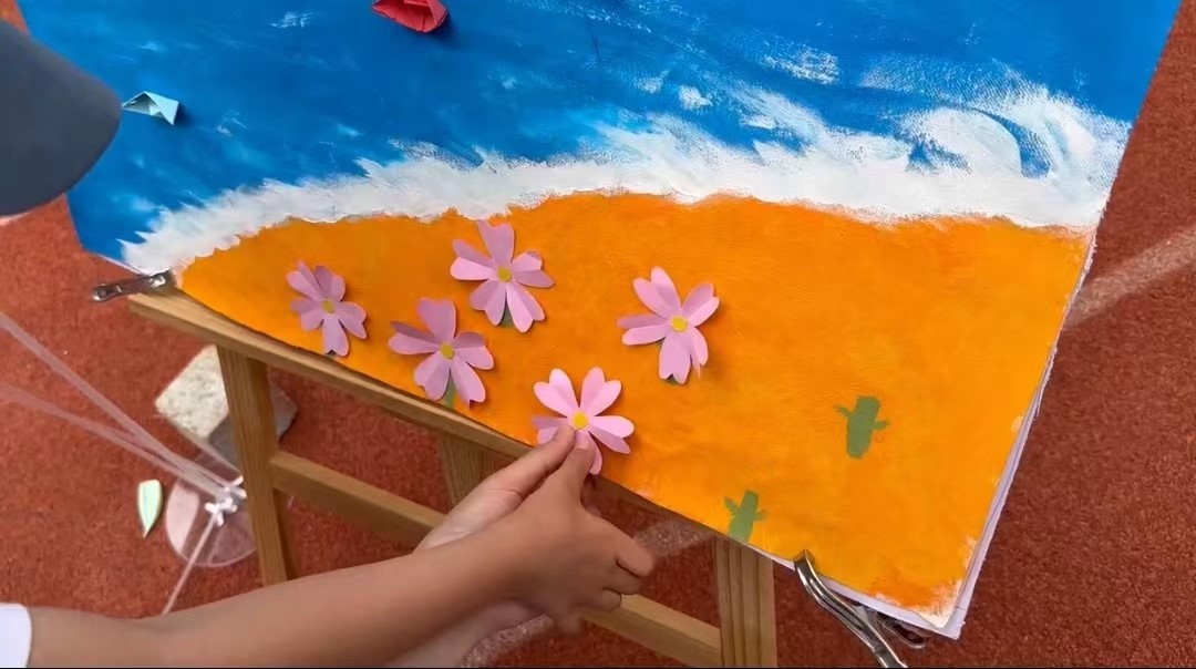 活動于下午開始,孩子們踏入了裝飾一新的操場,滿目琳瑯的海洋元素裝飾品瞬間吸引了他們的目光。首先,老師帶領(lǐng)孩子們來到了簽到區(qū),在畫板上貼上了小船和花朵簽到,象征著“花開盛夏,乘風(fēng)遠(yuǎn)航”的美好祝愿,這一簡單而有意義的儀式拉開了藝術(shù)節(jié)的序幕。