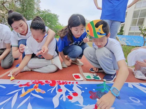 在“深海奇境——學(xué)有所獲”與“向海風(fēng)許愿——時光印記”環(huán)節(jié),孩子們將之前所有課程的作品粘貼到畫布上,并且貼上星星向星星許愿,最終創(chuàng)造出了一個獨(dú)一無二的藝術(shù)作品,這個作品象征著他們對未來美好的期許。這一時刻,場地內(nèi)洋溢著實踐團(tuán)與康復(fù)中心的教師們的感動和自豪。