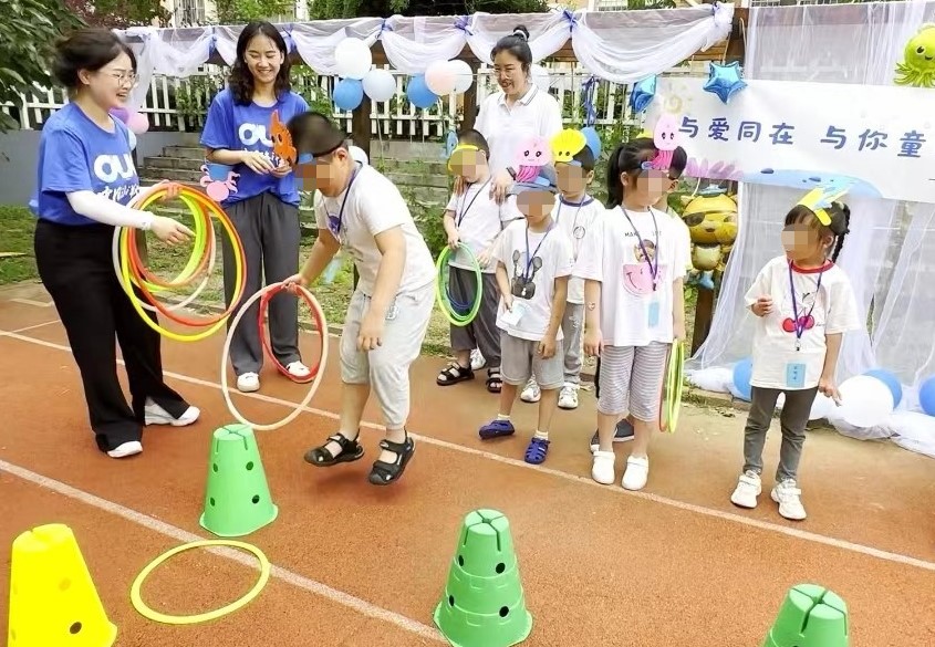 到了本次海洋音樂藝術(shù)節(jié)中的正式環(huán)節(jié),先是一首《游啊游》,孩子們揮舞著花球,在奧爾夫音樂中提升自己的肢體協(xié)調(diào)能力。同時,為了增強(qiáng)孩子們的感統(tǒng)能力,實踐團(tuán)特別設(shè)計了套圈感統(tǒng)游戲。孩子們積極參與,努力投入到游戲中,即使沒有成功也愿意不斷嘗試。