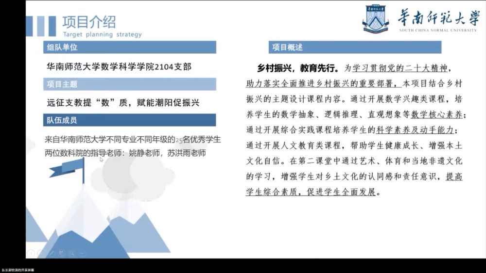 鄉村振興,教育先行,為學習貫徹黨的二十大精神助力落實全面推進鄉村振興的重要部署,增強學生對鄉土文化的認同感和責任意識,華南師范大學數學科學學院2104支部赴汕頭市銅盂中學服務隊(以下簡稱星瀾隊)與汕頭市銅盂中學合作開展主題為“遠征支教提‘數’質,賦能潮陽促振興”的暑期三下鄉社會實踐活動,同時為配合潮陽區教育局安全管理工作,此次活動轉為線上開展。2023年7月15日,星瀾隊舉行了開營儀式和破冰班會,正式開啟了本次星瀾夏令營之旅。