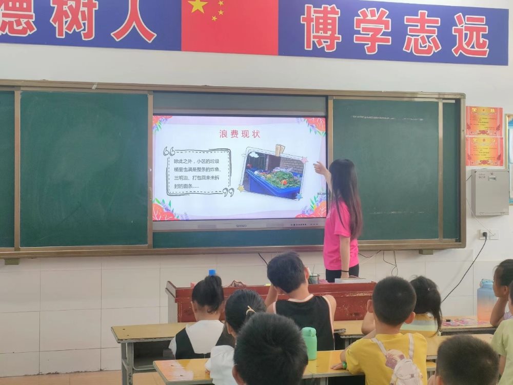 活動在同學們一聲聲“鋤禾日當午,汗滴禾下土,誰知盤中餐,粒粒皆辛苦”的朗朗書聲中拉開帷幕。李冰老師用猜謎語的游戲來引起同學們對課堂的興趣,也增加了同學們對農作物的認識,用“一粥一飯,當思來之不易;半絲半縷,恒念物力維艱”等詩詞提出珍惜糧食的重要性。接著,老師向同學們講述了目前我國和美國、歐洲等目前存在巨大的浪費現象,由此推及到日常生活中也存在著巨大的浪費現象,每年被倒掉的食物,足以供應兩億人一年的口糧;目前全球都存在著“饑餓無處不在”的嚴重問題,每三十個人中,就有一個人瀕臨餓死,每九個人中,就有一個人餓著肚子睡覺。浪費糧食不僅給我國糧食生產帶來較大壓力,產生的大量廚余垃圾,還會導致環境污染。抵制浪費糧食,對守護糧食安全,保護生態環境也有重大意義,因此節約糧食迫在眉睫。