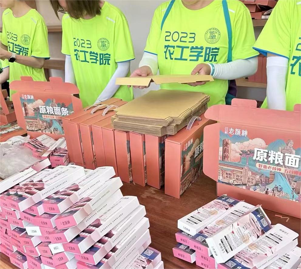 在王振王經理的帶領下,實踐團成員體驗了老顏神原糧面條的包裝流程。從折包裝盒、組裝提手、裝填原糧面條到最后打包成一盒完整的產品,全部都是手工操作。實踐團成員們經過王經理的指導,分成不同的小組,分工合作,迅速組建成了一條效率奇高的包裝流水線。一箱一箱的成品被包裝好,大家心中都有滿滿的成就感。