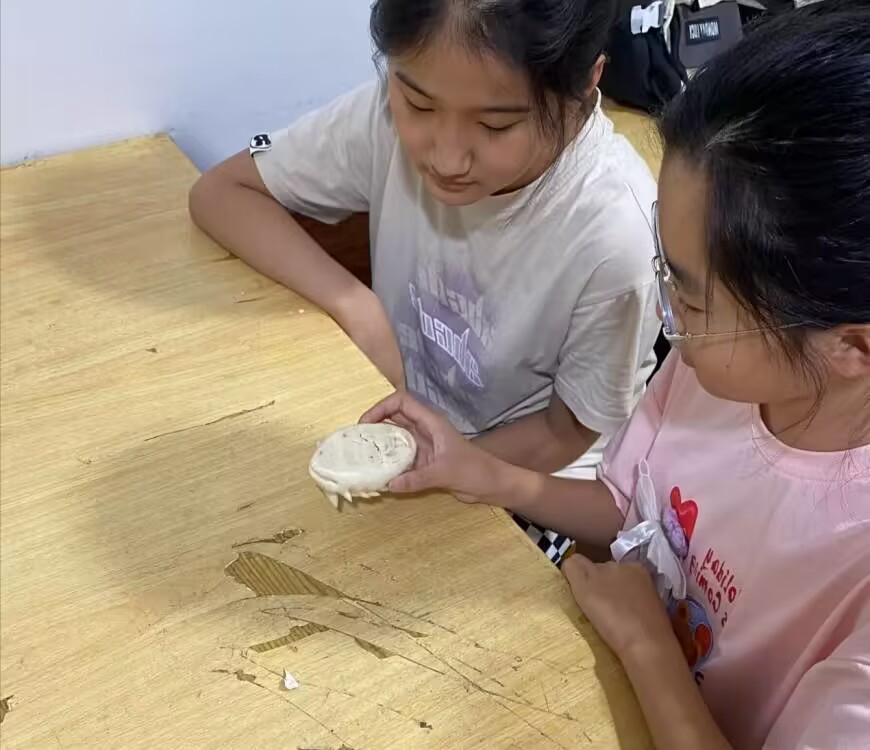 葛村榼子,又稱“餑餑榼子”,最早記載于《齊民要術》,是一種帶有花紋圖案的模具,用來印制面食,因產于青島市即墨區龍山街道辦事處葛村而得名,傳承至今已有600余年的歷史。隨著時代的發展,榼子的應用越來越廣泛,不僅春節的時候使用,其他節日也有專用的榼子,如清明節、中秋節的餑花榼子、月餅榼子等。家逢喜事,如結婚娶親、小孩過百歲、老人壽宴、上梁蓋屋等也要用到榼子,還有祭山、祭海等祭祀場面,更需要有面食出場,榼子面食制品早已滲透到人們的日常生活中的方方面面。通過實踐隊員的詳細介紹,同學們了解了葛村榼子的發展歷史和用途,并對榼子文化表現出濃厚的興趣。講解過后實踐隊員拿出了幾個榼子和用榼子制作而成的金魚、元寶等榼花,學生們通過仔細觀察,不禁感嘆葛村榼子的制作之精細,感悟到古代人民的智慧。