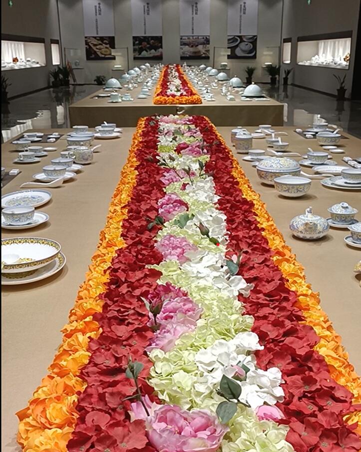 齊稷瓷色暑期社會實踐團隊步入華光國瓷瓷器展廳,首先映入眼簾的是一批擺放整齊,制作精美的國宴用瓷。仔細端詳華光國瓷所制作的國宴用瓷瓷器,每一個都彰顯著中華民族的絢麗多彩的優秀文化,卻又不失肅穆與端莊。