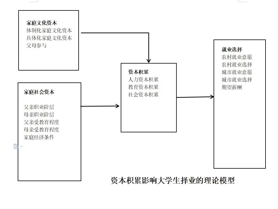 團(tuán)隊(duì)成員結(jié)合相關(guān)文獻(xiàn)資料,梳理了諸多資本對(duì)于大學(xué)生就業(yè)觀影響的脈絡(luò)關(guān)系。具體來說,家庭社會(huì)資本,實(shí)際上就是父母職業(yè)階層,父母受教育程度,以及家庭的經(jīng)濟(jì)條件。基于代際交流理論,家庭經(jīng)濟(jì)條件影響著個(gè)人經(jīng)濟(jì)地位及職業(yè)的繼承。而家庭文化資本指的是一個(gè)家庭所擁有的教育背景、價(jià)值觀、知識(shí)和社會(huì)關(guān)系等方面的資源,對(duì)大學(xué)生擇業(yè)有著重要的影響。