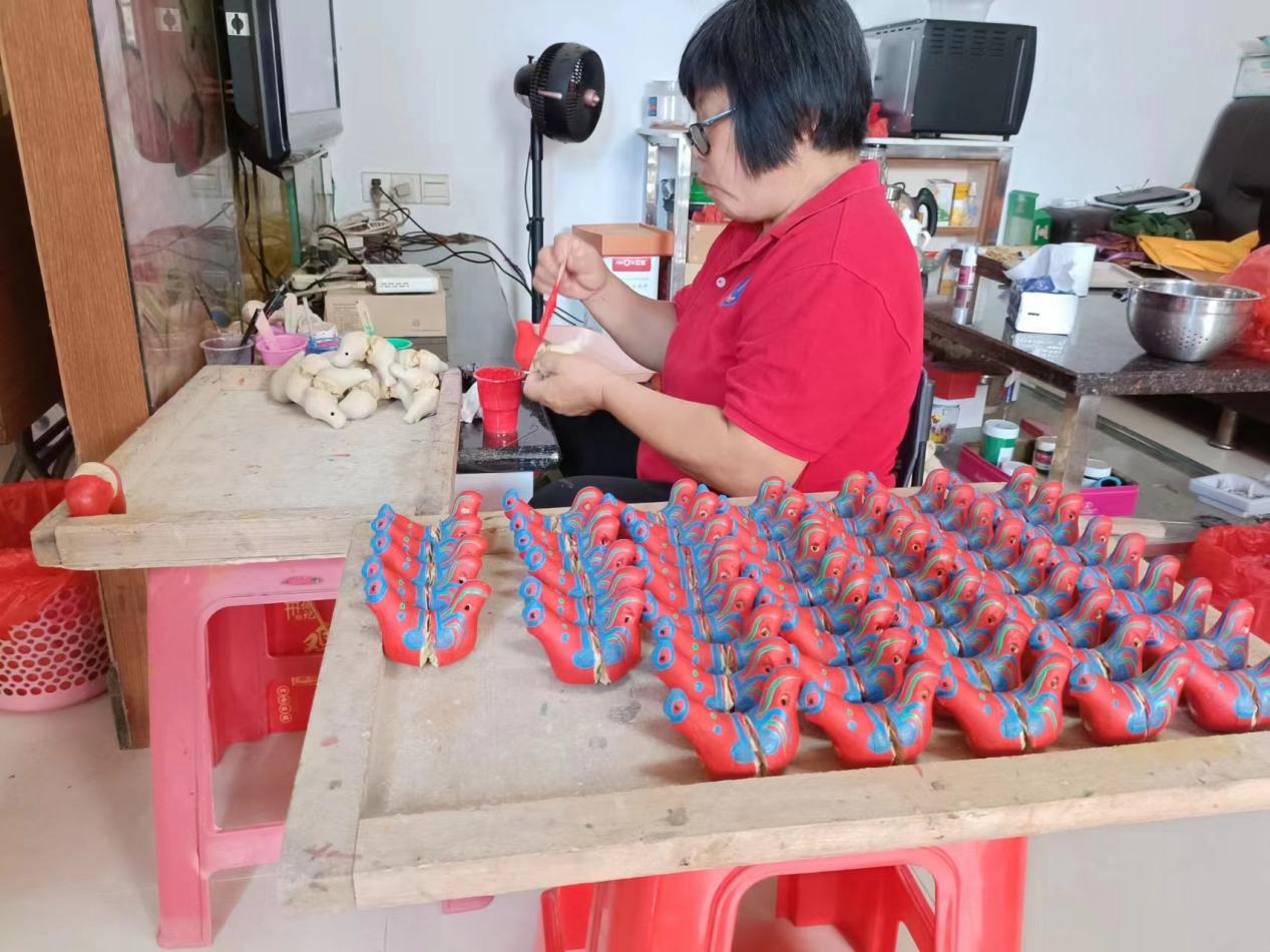 經了解,是為了讓文化遺產注入新動力,引發更廣泛關注,吸引新生代的視線,鎮濠泥雞現任傳承人馮永勇一直在文創領域積極探索。他成立了“鎮濠泥雞”文化傳承基地,首創泥雞DIY課堂,推出文創旅游紀念品,深受本地市民及各地游客的歡迎。目前,在江門及開平市部分景區和廣東省部分博物館都設有“鎮濠泥雞”專柜。“我相信只要把握機遇,將文化遺產傳承與創新相結合,“鎮濠泥雞”一定會在市場上占有一席之位。”馮永勇自信道,臉上露出憧憬的笑容。