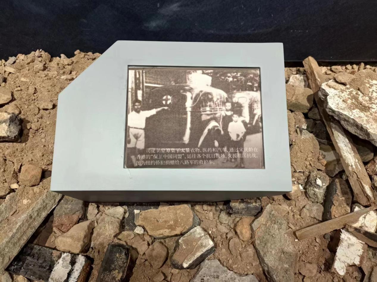 抗戰時期有人流躥逃亡、有人奮勇抗敵、有人從愛國熱血青年轉變成高喊“亡國論”的漢奸......多少人趨利避害忘記了自己的初心和追求,司徒先生一生踐行著“茍利國家生死以,豈因禍福避趨之”的堅定愛國意志。彩色的背景鑲嵌著過去的圖片,最虹麗的故事往往融在最樸素的色彩中。司徒先生婉拒日軍的漢奸之職機智逃離他們的軟禁,對國民黨腐朽的內核搖頭,在外大力陳述民族抗日現狀,并集資捐款。一處角落堆放著一些碎石,只見前面的標牌寫著“五年5400多萬美元、為抗戰捐款6900萬、車輛100、飛機三十、公債43億美元”。在現在看來都是巨額的數字,在當時的年代更是不必多說。司徒先生不慕名利不做官,一心只為守護中華民族的家園。他審時度勢,慧眼識人,堅定不移地選擇中國共產黨。司徒先生偉人的形象在我們心中逐漸豐滿。我們靜靜地看著眼前斑駁的碎土,垂眸默念“先生千古,懿德長存”。