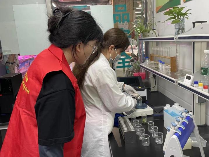 此外,在農(nóng)貿(mào)市場檢測人員的帶領(lǐng)下,實(shí)踐團(tuán)成員觀摩學(xué)習(xí)了每日抽檢全過程。檢測員首先來到各個(gè)攤位挑選部分樣品,隨后進(jìn)入快檢室內(nèi)進(jìn)行檢測。檢測員展示了檢測實(shí)驗(yàn)全過程并耐心講解。她說,不同的食用農(nóng)產(chǎn)品品類有著不同的檢測方法,如蔬菜瓜果類的產(chǎn)品需稱取部分樣品,隨后將樣品剪碎分別放入試管中,加入緩沖液、滴入顯色劑、搖勻,即可將試管放入專用檢測儀中等待檢測結(jié)果顯示。