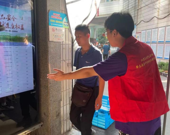 小小“菜籃子”拎起大民生。實(shí)踐團(tuán)成員走訪了鼓樓區(qū)寶船社區(qū)、蘇州路社區(qū)等12個(gè)農(nóng)貿(mào)市場,旨在了解農(nóng)貿(mào)市場對(duì)于食品安全的常規(guī)監(jiān)察工作。通過與農(nóng)貿(mào)市場管理員、快檢中心檢測人員、農(nóng)貿(mào)市場攤主的交流,實(shí)踐團(tuán)成員了解到鼓樓區(qū)農(nóng)貿(mào)市場會(huì)根據(jù)季節(jié)特點(diǎn)和市場內(nèi)食品存在的突出問題提前制定好監(jiān)測計(jì)劃,每日對(duì)部分樣品進(jìn)行檢測,保證市場內(nèi)所有的食用農(nóng)產(chǎn)品商戶全覆蓋。每日檢測結(jié)果都將按時(shí)上傳至南京市市場監(jiān)管局農(nóng)貿(mào)市場食品安全檢測監(jiān)管系統(tǒng),如有發(fā)現(xiàn)檢測結(jié)果異常,則立即下架產(chǎn)品,同時(shí)每個(gè)農(nóng)貿(mào)市場也配有大屏幕供市民更直觀地觀看抽檢結(jié)果。